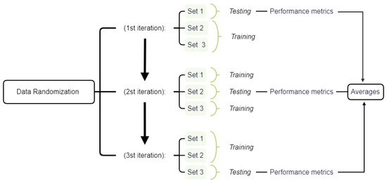 Flowchart of the stages of training and testing of classifiers in an example of k-fold, with k equal to 3.