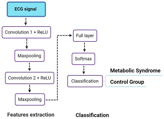 Figure 3. Convolutional Neural Network layers used for classifying electrocardiography signals as belonging to the control group or to the metabolic syndrome group.