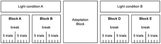 Block diagram of the experimental design. Each participant completed four blocks of trials (Blocks A–B under light condition A and Blocks D–E under light condition B), with the order of light conditions and blocks randomized. Light conditions A and B could be lights on or off. Each block consisted of ten trials, with a short break after five trials. There was an adaptation phase with lights off and eyes closed between the two light conditions.
