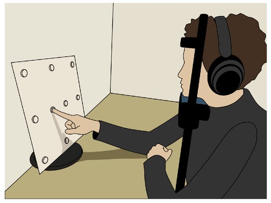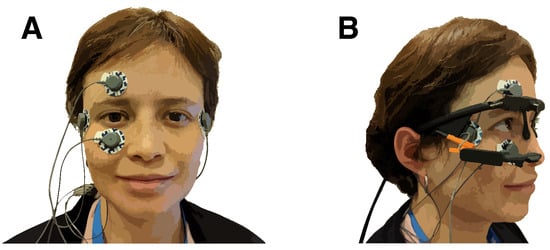 The experiment took place in a soundproof booth. The participants were seated at a table with their heads on a chin rest. In front of the participants, at a distance of 28 cm, was the target pattern on a cardboard square taped to a screen. The target pattern used in the experiment was made from round felt stickers. The participants wore active noise-canceling headphones (ATH-ANC7b-SViS, Audio-Technica, Tokyo, Japan) to hear the instructions and suppress environmental noise. The participants also wore eye-tracking glasses (Pupil Core, Pupil Labs, Berlin, Germany) with a world-facing camera and monocular tracking of the right eye [56]. The eye-tracking glasses were connected to a MacBook Air (3.1 GHz Intel Core i7, 16 GB RAM, 2017, macOS High Sierra, Apple, Cupertino, CA, USA) running Pupil Capture (version 1.13.31, Pupil Labs, Berlin, Germany). The experiment was controlled by custom software written in C++11 with openFrameworks 0.9.4 [57]. Eye movement was recorded using electro-oculography (EOG). The participants wore disposable electrodes (Kendall ARBO H124SG, CardinalHealth, Dublin, OH, USA) above and below their right eye (vertical direction) and outside their right and left eye (horizontal direction), as shown in Figure 2. A fifth electrode on the mastoid behind the right ear served as a reference. The electrodes were connected to a Shimmer3 ECG/EMG Bluetooth device (Shimmer, Dublin, Ireland) that was placed into a pouch strapped diagonally across the participants’ backs.