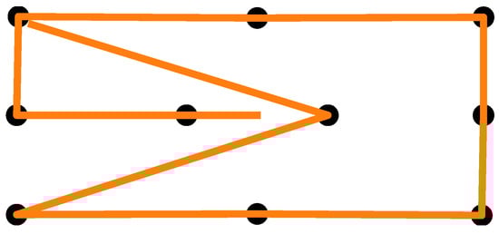 After giving consent to participate in the study, the participants’ skin above and below the right eye, as well as at the corner of both eyes and behind the right ear, was cleaned with alcohol cleaning wipes. EOG electrodes were placed on the cleaned skin areas and connected to a Shimmer unit that was stored in a small bag over the participant’s shoulder. A quick visual signal check was performed to confirm the electrode placement by means of the signal quality. Next, the participants were given the eye-tracking glasses, and the experimenter adjusted the eye camera. The participants were asked to use a headrest that was mounted on a table in front of them to keep their head in a stable position. At a distance of 28 cm in front of the headrest was a widescreen monitor. Using the Tobii Glasses PyController 2.2.4 [58], the eye tracker was calibrated. After successful calibration, a cardboard featuring felt-dot tactile markers (raised dots as shown in Figure 3) was pasted on top of the monitor. The participants completed two to three practice trials to familiarize themselves with the tactile pattern and the auditory signals. The experiment employed a 2 × 2 within-subjects factorial design with the lighting condition (lights on vs. lights off) and eye state (eyes open vs. eyes closed) as factors, resulting in four experimental conditions. The order of the lighting conditions was counterbalanced across participants, and within each lighting condition, the order of eye states was also counterbalanced. The participants performed two blocks in each lighting condition with a short one-minute break after five trials and in between the blocks. A block consisted of 10 measurements in total. For all four experimental conditions, the participants were instructed to touch the markers on the cardboard with their index finger and direct their gaze toward the tip of their finger. When the participants heard an instructional beep at 250 Hz, they had to move their finger between the markers while maintaining real or imaginary eye contact with the tip of their finger, depending on the experiment condition. The marker pattern is shown in Figure 4. Each trial began with a two-second initial phase, during which the participants fixated on the center of the cardboard. Afterward, they sequentially fixated on the 10 markers shown in Figure 4, with each fixation lasting two seconds. The upper-left marker was used twice, resulting in a total of 11 fixations. Combined with the initial phase, this yielded a trial duration of 24 s. After the first lighting condition, the lights in the room were turned off, or kept off, and the participants closed their eyes for 15 min while listening to an English audiobook read in a male voice. This adaptation phase was intended to mitigate the signal drift due to dilating pupils during lighting changes, but was used for all condition combinations. After the adaptation phase, the participants performed two more blocks in the other lighting condition—again, with a one-minute break in between the blocks. After the experiment, the participants removed the eye-tracking glasses and the experimenter disconnected the Shimmer unit and assisted the participant in removing the electrodes.