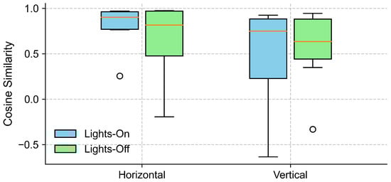 To examine the effect of lighting conditions on the alignment between the EOG and eye-tracking signals, we computed the cosine similarity between the grand-averaged EOG and eye-tracking signals separately for lights-on and lights-off conditions, in both the horizontal and vertical gaze directions (see Section 4.2). As shown in Figure 6, the horizontal direction yielded a high cosine similarity across the participants under both lighting conditions, with slightly higher and less variable values observed for the lights-on trials. In contrast, the cosine similarity in the vertical direction exhibited a greater variability.