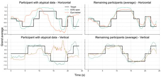 Comparison of eye movement signals between a participant with myopia and uncorrected vision and the group average. Each subplot displays the grand-averaged signals over time for the horizontal (top row) and vertical (bottom row) directions. The left column shows data from one participant whose eye-tracking signals exhibited low alignment with the EOG and target trajectories. The right column presents the average signals from the remaining participants, excluding that case. Black lines represent the target trajectory, while dashed lines indicate the EOG (green) and eye-tracker (orange) signals recorded under the eyes-open condition.