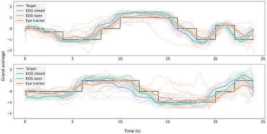 Figure 9 shows the grand average of EOG signals during the eyes-open and eyes-closed trials, the eye-tracking signals during the eyes-open trials, and the corresponding target trajectories in both the horizontal and vertical directions across 11 participants.
