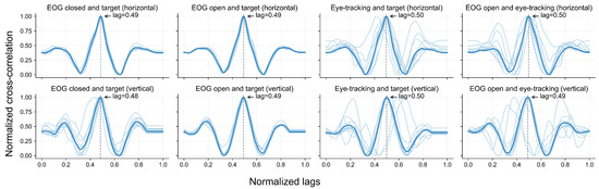 The grand-average signals from both modalities closely followed the target trajectory over time across both lighting conditions, as illustrated in Figure 9, with some deviation across participants. The cross-correlation analysis (Figure 10) further supported this finding, revealing consistent correlation peaks near a normalized lag of 0.5 across all signal pairs. Notably, the EOG signals tended to slightly precede the eye-tracking signals, which may reflect the earlier detection of oculomotor activity via EOG compared to the visual-capture latency of eye trackers. Similar observations of electromyography (EMG) signals preceding computer vision detection have been reported in prior studies [62,63].