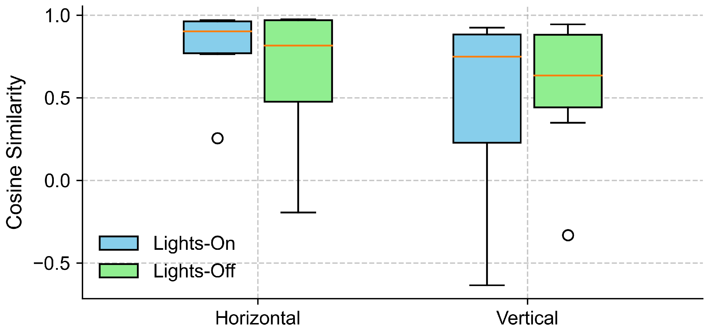 | Vertical | Lights on | 0.699, 0.001 | 19, 0.734 | −0.25 |