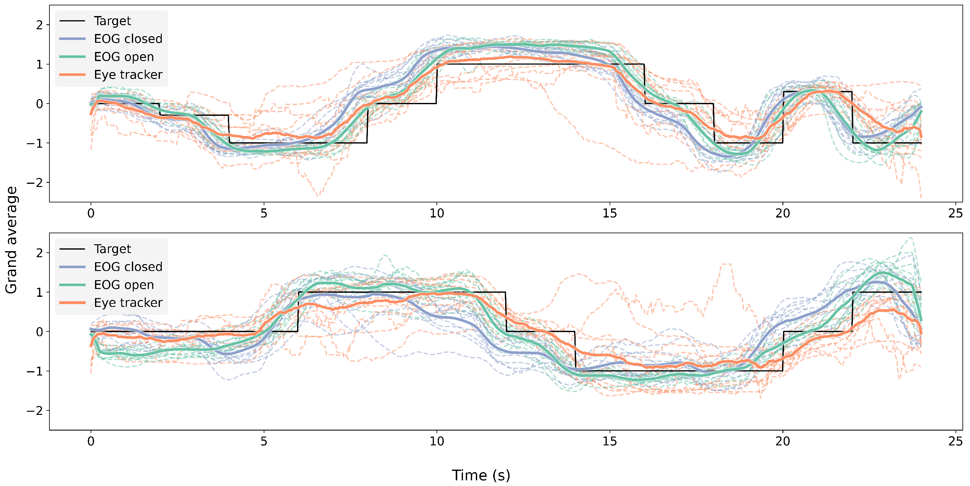 - We established eye tracking as a benchmark for evaluating EOG-based gaze direction estimation by comparing both modalities under eyes-open conditions.