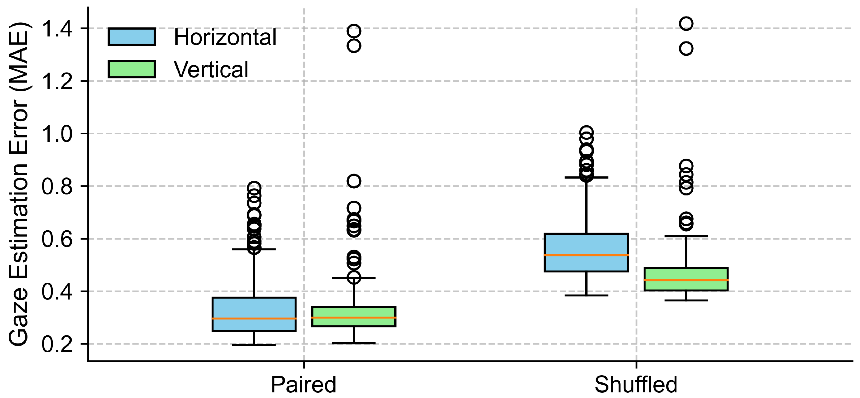 - We validated the effectiveness of EOG-based gaze estimation under eyes-closed conditions by comparing aligned EOG trajectory data with shuffled (chance-level) control data.