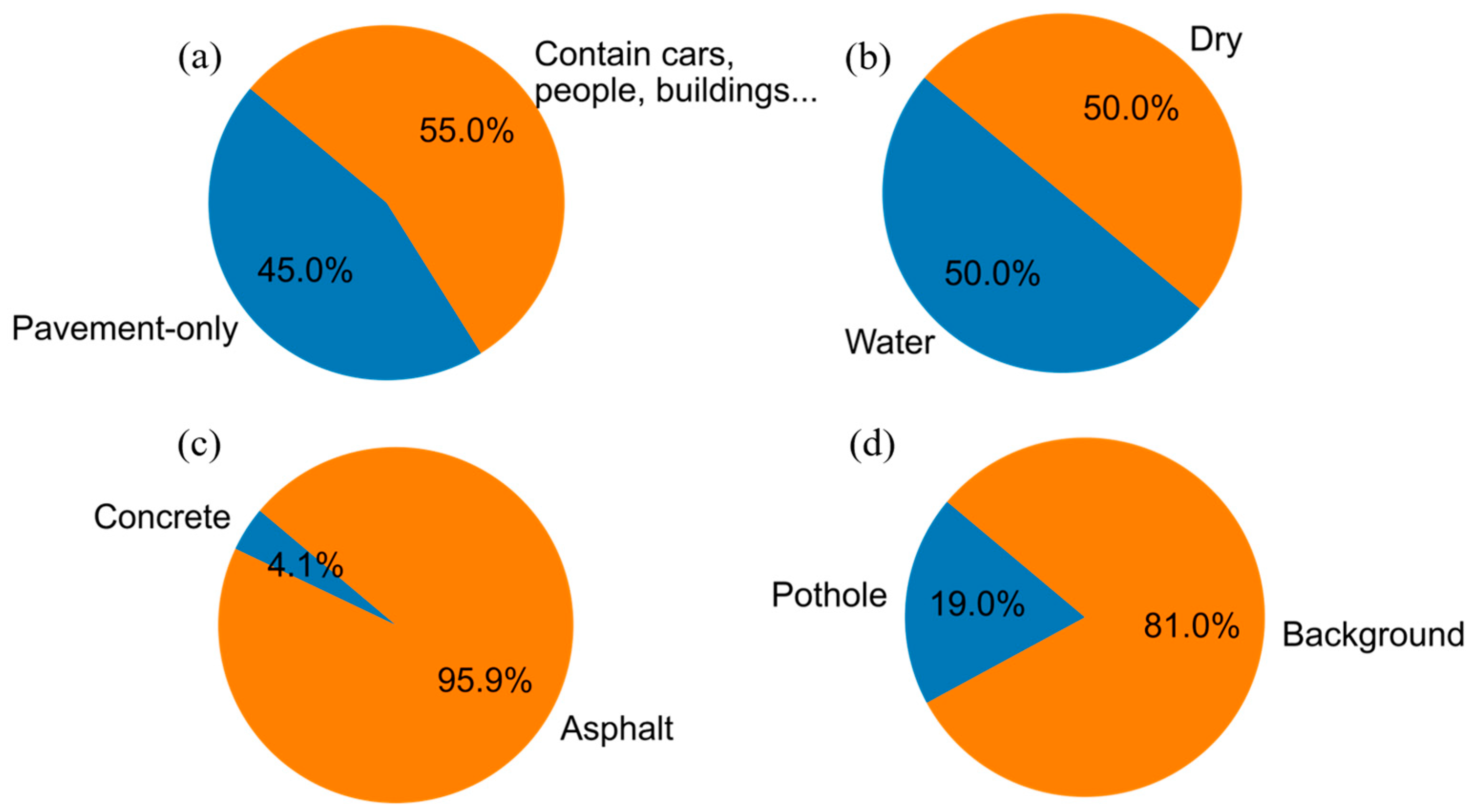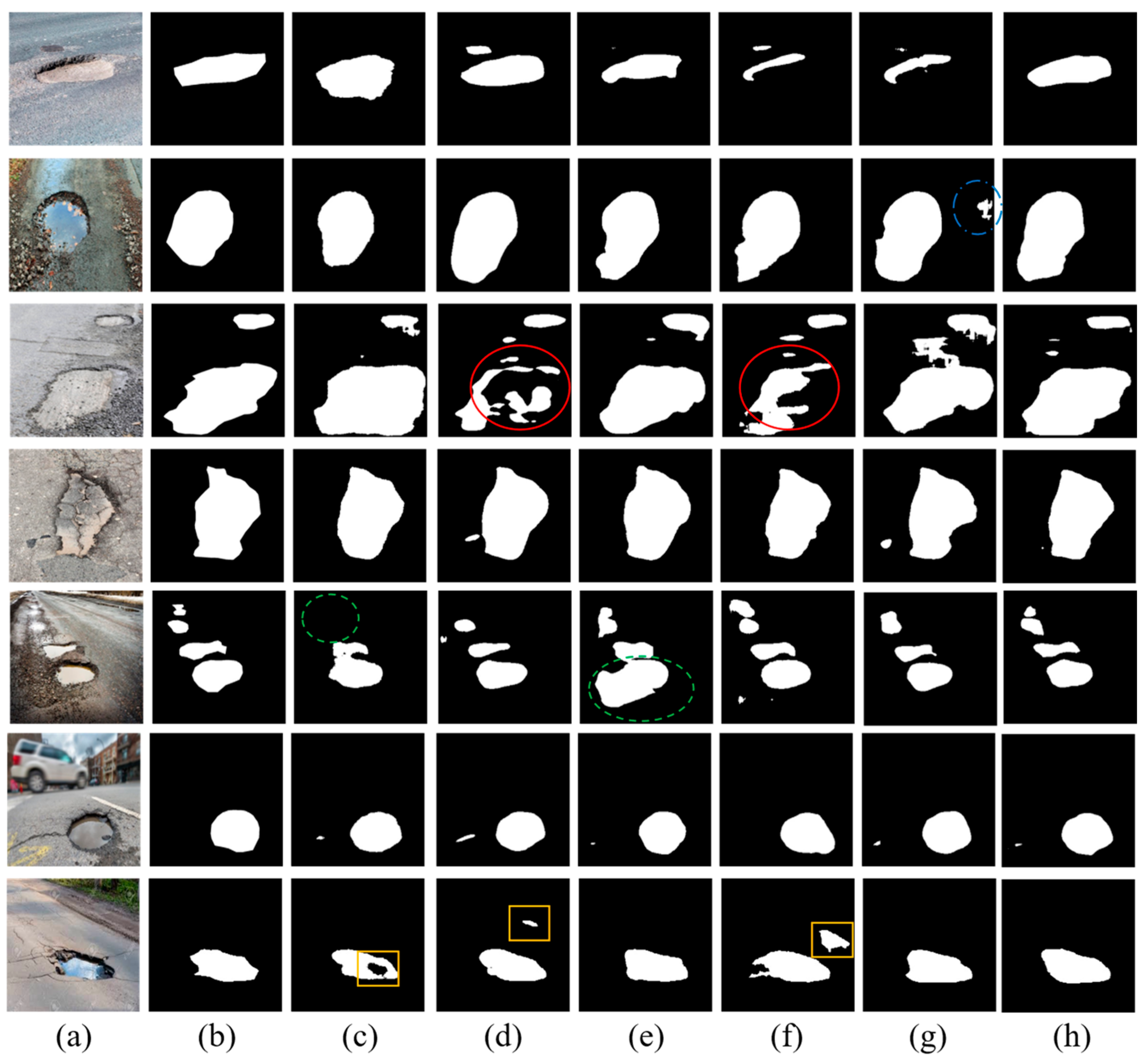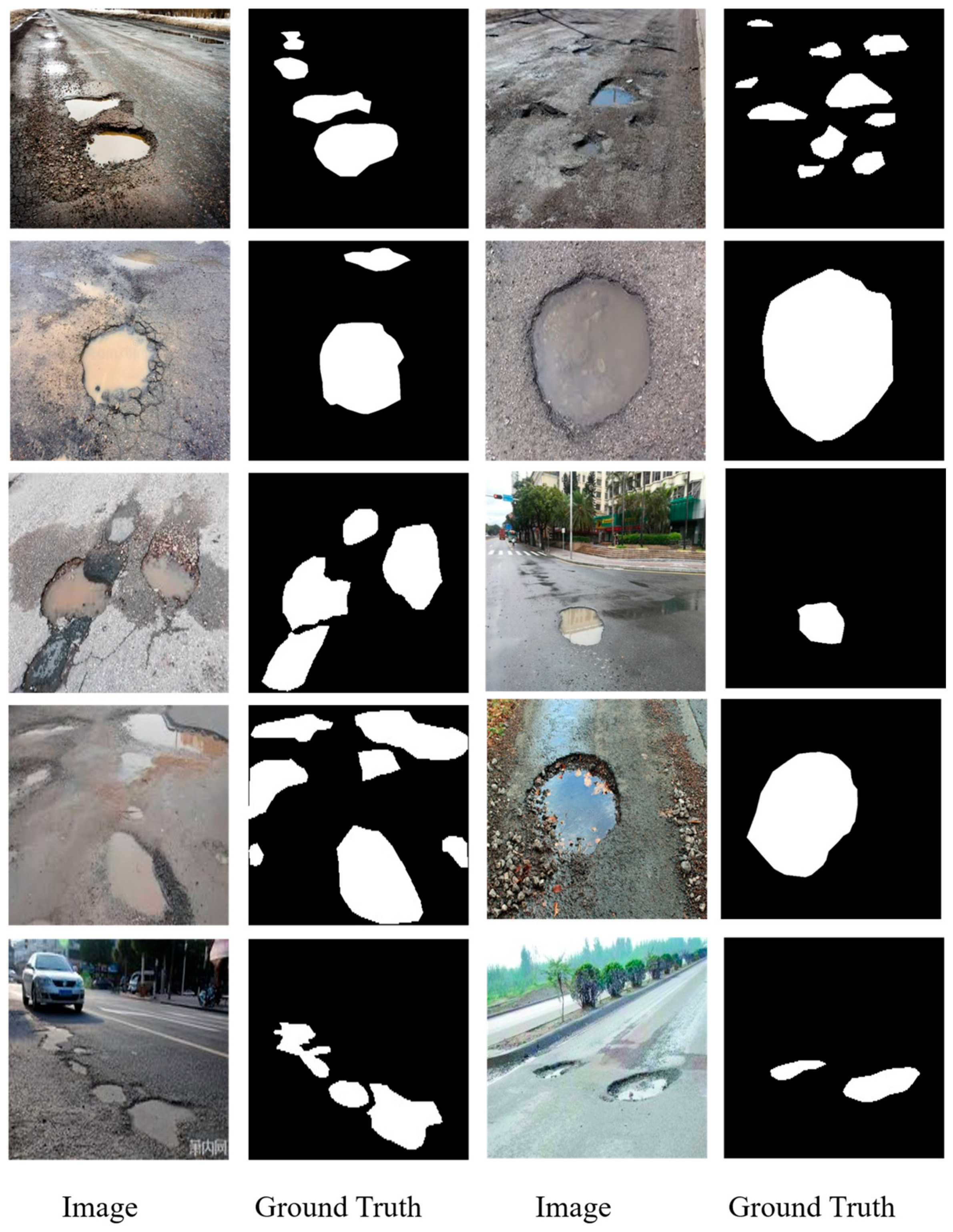 - Fan, R.; Wang, H.; Bocus, M.J.; Liu, M. We learn better road pothole detection: From attention aggregation to adversarial domain adaptation. In Proceedings of the Computer Vision–ECCV 2020 Workshops, Glasgow, UK, 23–28 August 2020; Proceedings, Part IV 16. 2020; pp. 285–300. [Google Scholar]