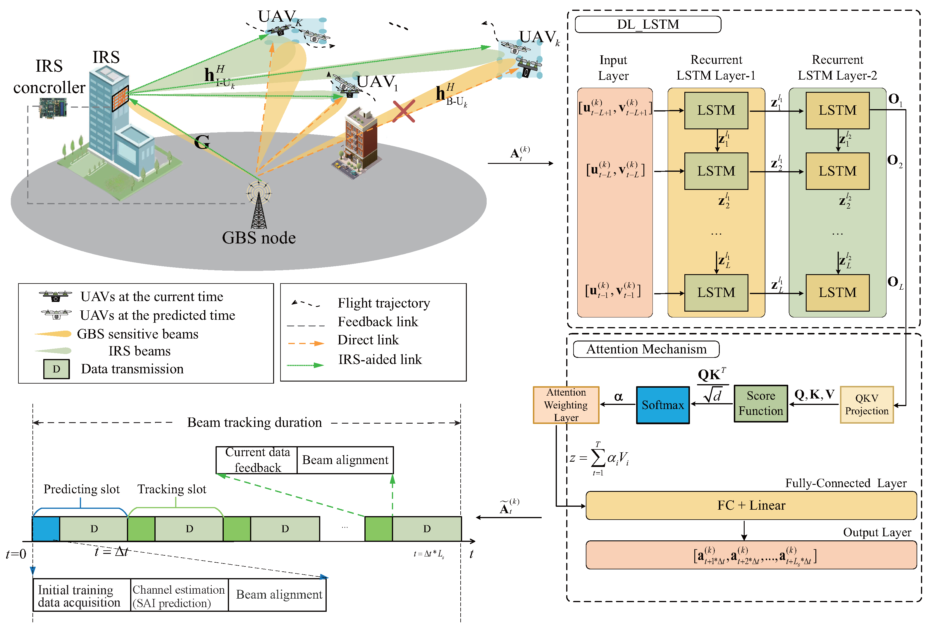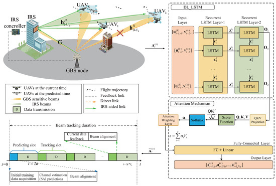 - The attention-based double-layer long short-term memory (DL-LSTM) neural network is exploited to effectively predict the SAI of each high-speed UAV for the next frame. Therefore, the knowledge of each UAV’s trajectory or angular transition model is not required. Then, the optimal beam coverage (BC) and the number of beam components for each UAV can be efficiently estimated based on the predicted SAI, which fully considered the prediction errors, the angular process noise, and the high-speed UAV motion, and always supports the coverage of high-speed UAVs within a frame.