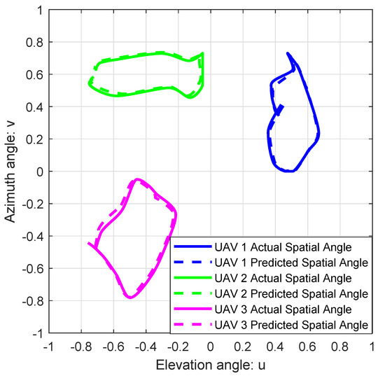 Figure 3 shows the comparison between the actual spatial angles and the predicted spatial angles of high-speed multi-UAVs. Although the UAVs move at high speeds, it can be observed from Figure 3 that the spatial angle prediction error for each UAV remains consistently minimal at every moment. From Figure 3, the average displacement errors (ADE) between the actual and the predicted SAIs of UA, UA, and UA are 0.0147, 0.009, and 0.0143, respectively. Here, ADE denotes the average Euclidean distance between the actual and the predicted SAIs. Therefore, by utilizing the attention-based DL-LSTM, the GBS can effectively predict the spatial angles of high-speed multi-UAVs.