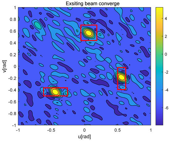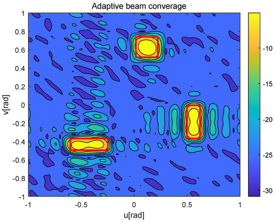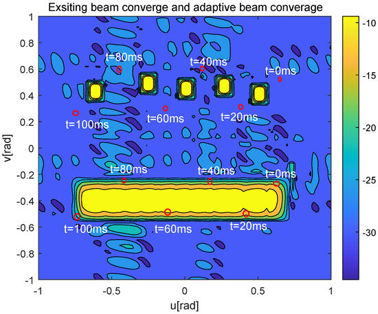 Figure 8 further shows the worst-case UAV’s beam gain, where the red boxes represent the BC area corresponding to each moving UAV, and the red dots represent the SAI of the worst-case UAV at the corresponding time . From Figure 8, the existing algorithm only provides a good beam gain in the central point of the current and the next prediction moment of the worst-case UAV, but the beam gain decreases sharply in nearby areas. In contrast, the beam generated by the proposed algorithm always points to the potential moving area of the worst-case UAV.