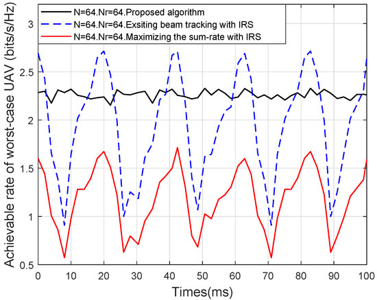 To more intuitively show the beam tracking performance, the worst-case UAV’s achievable rate versus time when is presented in Figure 9. As shown in Figure 9, despite the help of IRS, “Existing beam tracking” outperforms the proposed algorithm at narrow beam alignment time, but its performance drops dramatically at other times, thereby easily resulting in link disconnection. At the same time, the performance of “Maximizing the sum-rate with IRS” also performs poorly and is instable compared with the other algorithms, since it benefits UAVs in favorable channels yet disadvantages those experiencing the worst-case CSI conditions. In contrast, the proposed algorithm always sustains the stable and robust performance of the worst-case UAV during a frame, since the worst-case UAV is given priority in the resources allocation under the min–max optimization framework. Consequently, the proposed adaptive dual-beam tracking design achieves a well-balanced resource allocation, which is vital for ensuring fair, stable, and reliable communications in IRS-HSMUAVNs.
