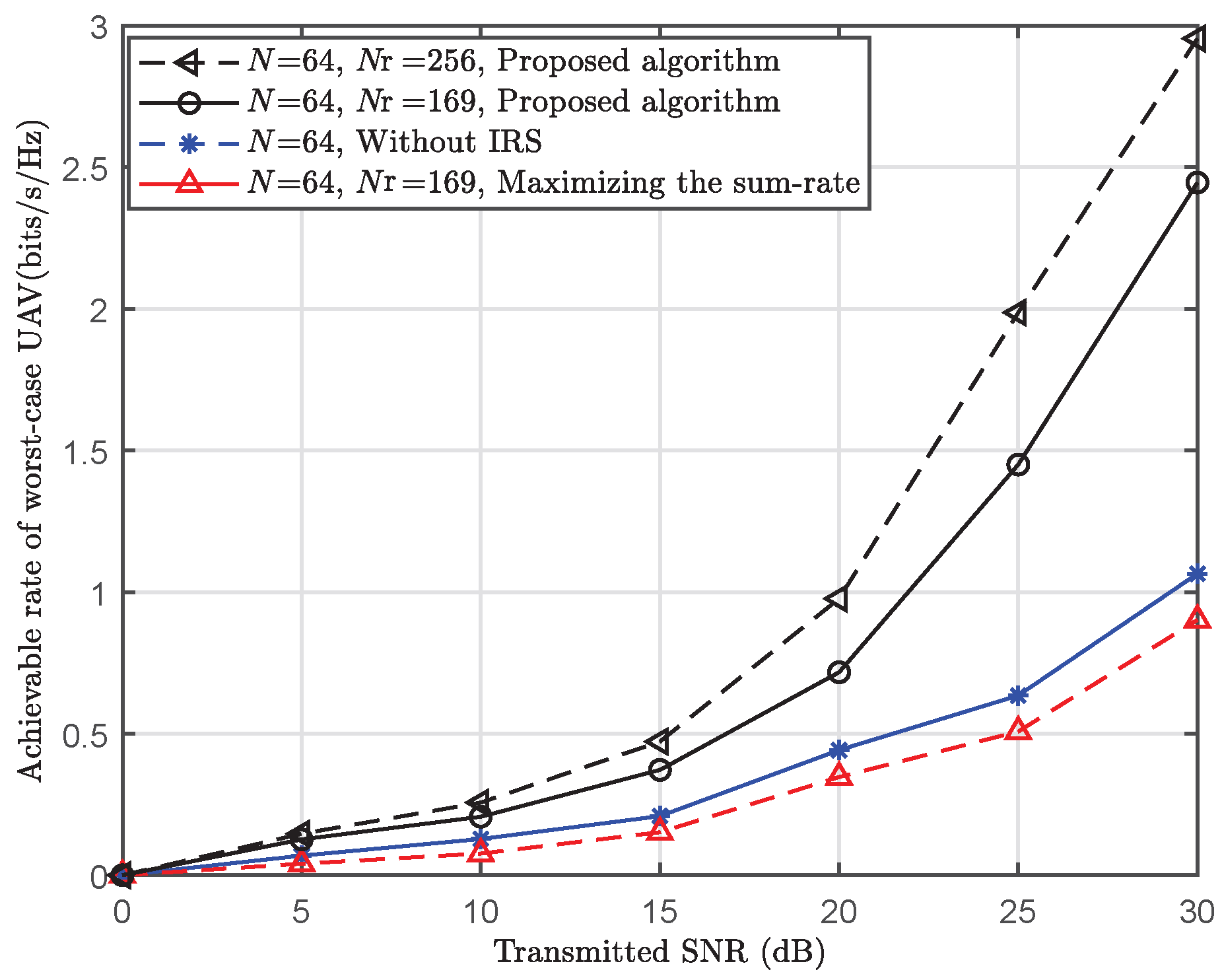 - To enhance the edge UAV’s performance and maintain a reliable communication link in HSMUAVNs, a worst-case UAV’s received beam components signal-to-interference plus noise ratio (SINR) maximization problem is formulated by jointly optimizing GBS’s beam components and IRS’s phase shift matrix (PSM). Furthermore, the formulated non-convex problem is effectively tackled by an iterative algorithm based on semi-definite relaxation, the bisection method, and eigenvalue decomposition techniques.