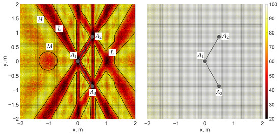 Heatmaps showing integer ambiguity resolution (IAR) success rate (SR) for placing a fourth antenna to form a third baseline with fixed antennas , , and . (Left): MC-LAMBDA method; (right): proposed method. Regions of low SR (marked by L) correspond to parallel or nearly duplicate baselines, which should be avoided. Less obviously, there exists a region of medium SR denoted by M, where we choose to place the fourth antenna, so that the IAR process would be more sensitive to changes in its parameters, in contrast to the high SR region (H). Each grid point represents an average over 200 iterations with random attitudes, with standard deviations of code and attitude measurements of 20 cm and 3° for MC-LAMBDA and the proposed method, respectively.