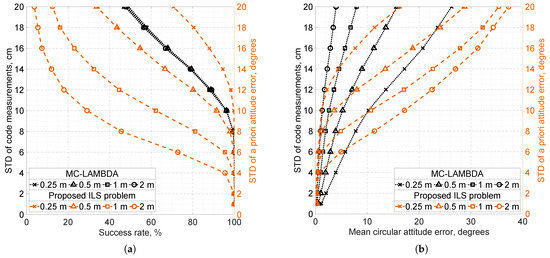 As shown in Figure 3a, the IAR success rate of MC-LAMBDA is nearly insensitive to baseline length, in contrast to the proposed method. For the considered baseline configurations, the success rates of MC-LAMBDA and the proposed method are comparable and exceed when the a priori attitude error satisfies ° and the standard deviation of code noise does not exceed 6 cm.