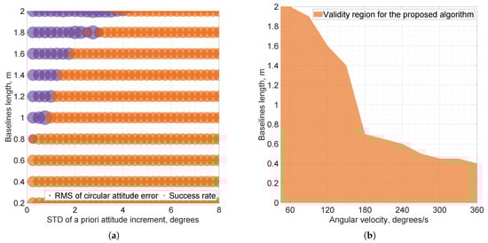Figure 3b further shows that, for short sub-meter baselines, the proposed problem formulation achieves a notable accuracy improvement over MC-LAMBDA when °, and the code noise level exceeds 6 cm. Specifically, under these conditions, the mean attitude error of the proposed problem solution does not exceed °, whereas the minimal mean error of MC-LAMBDA is approximately ° and is reached on a 1 m baseline.