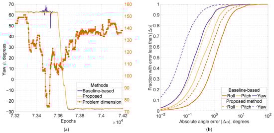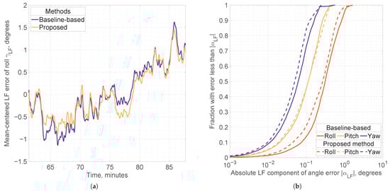 (a) Mean-centered low-frequency errors of the roll angle, , obtained by the baseline-based and proposed methods using the 5-antenna, dual-frequency GNSS setup (GPS, GLONASS, Galileo, and BeiDou) during one of the static intervals. (b) Cumulative distribution functions of the absolute low-frequency angle errors, , produced by the baseline-based (solid lines) and proposed (dashed lines) methods. Distributions are computed over epochs corresponding only to static intervals in the experiment.