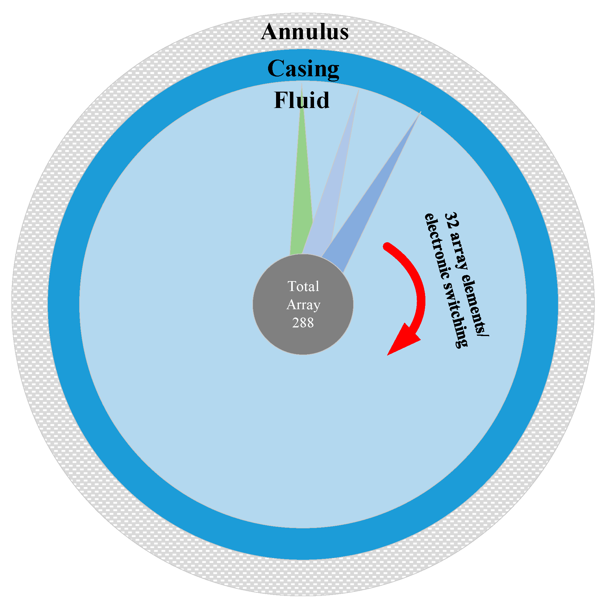 - Vos, H.C.L.; Schepers, R.; Vogel, J.A. An ultrasonic circular array transducer for pipeline and borehole inspection. In Proceedings of the IEEE 1988 Ultrasonics Symposium Proceedings, Chicago, IL, USA, 2–5 October 1988. [Google Scholar] [CrossRef]