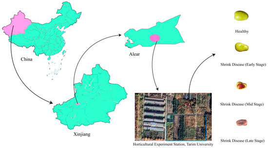 The experimental sampling for this study was conducted in jujube orchards located in Aral City, First Division, Xinjiang Production and Construction Corps, China, selecting the Junzao cultivar (Ziziphus jujuba Mill. cv. Junzao) as the research subject. To ensure the diversity and representativeness of the dataset, a total of four sampling sessions were conducted on 15 August, 25 August, 5 September, and 15 September 2024. During the sampling process, fruits were selected according to strict physiological criteria, including uniform maturity, regular shape, smooth and unwrinkled skin, absence of mechanical damage, vivid reddish coloration, and no visible signs of pest infestation or disease symptoms. As shown in Figure 2, the experimental sampling sites are located in Alear, Xinjiang, and the figure also presents representative appearances of healthy and diseased jujube fruits at different stages.