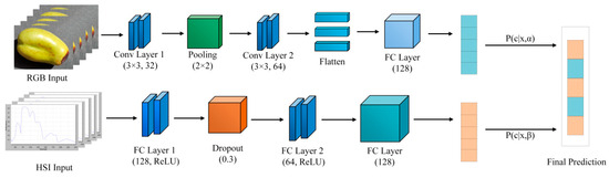 This study proposes a multimodal fusion model architecture consisting of a CNN branch and a MLP branch, which are designed to extract deep information from RGB images and key hyperspectral bands, respectively. The two branches are adaptively integrated via a learnable dynamic weighting mechanism, enabling accurate and robust detection of early-stage fruit shrinkage. The overall architecture of the proposed dual-branch multimodal network is shown in Figure 4. The network consists of a CNN branch for spatial feature extraction from RGB images and an MLP branch for spectral feature extraction from hyperspectral vectors. Both feature vectors are dynamically fused via learnable weights (α, β) and fed into a fully connected layer and Softmax classifier for final multi-class fruit shrinkage detection. The detailed design of each module is described in the following subsections.