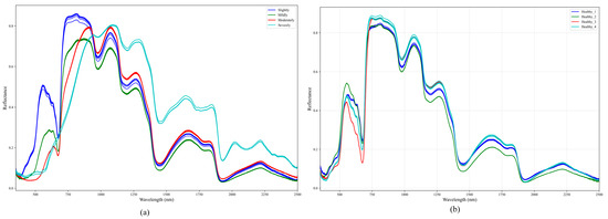 Normalized hyperspectral reflectance curves of different types of jujube. (a) Normalized spectral reflectance of four different grades of shriveled red dates. (b) Spectral reflectance of healthy red dates.