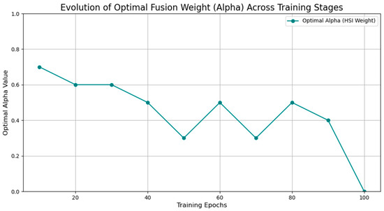 To investigate the dynamic contribution of each modality throughout the training process, a detailed analysis was conducted with the results presented in Figure 7. The figure illustrates the optimal fusion weight for the hyperspectral (HSI) modality, alpha, determined at 10-epoch intervals, revealing a dynamic interplay where the instantaneous optimal weight fluctuates as the models learn and refine their feature representations. While the optimal weight at any single training stage can vary, a key observation is that the value frequently oscillates around the 0.5 mark, with the average across all tested epochs being 0.44. Arguing that choosing a weight from a single, specific epoch (e.g., the value of 0.0 at epoch 100) could result in a model that is not generalizable, a weight of 0.5 was ultimately selected for the final model. This choice represents a robust and balanced strategy, ensuring that both the spatial features from RGB images and the spectral features from HSI data contribute significantly to the final classification. This approach prevents the model from becoming overly dependent on a single data source, thereby enhancing its stability and generalizability for unseen data.