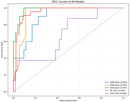 To further evaluate the discriminative performance of different models, the receiver operating characteristic (ROC) curves of all models were plotted, as shown in Figure 8. The proposed model achieved the highest AUC value of 0.979, outperforming traditional machine learning approaches such as Random Forest (AUC = 0.955) and KNN (AUC = 0.935). Although some models, including RF and KNN, obtained relatively high accuracy, their F1 scores were considerably lower, which can be attributed to the class imbalance in the dataset. This imbalance leads to a bias toward the majority class, resulting in inflated accuracy but degraded precision–recall balance. Overall, the ROC analysis confirms that the proposed model exhibits better robustness and generalization capability across different classes.
