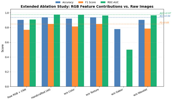 To evaluate the contribution of handcrafted RGB features, we conducted an ablation study comparing the performance of the full handcrafted feature set against models with individual feature groups removed (color, texture, Gabor, and wavelet). As shown in Figure 10, removing any single feature group led to a decrease in model performance, with the most significant degradation observed when Gabor features were excluded (Accuracy = 0.778, F1 = 0.000, AUC = 0.500), indicating that Gabor-based texture information plays a crucial role in distinguishing subtle surface deformation patterns related to early-stage shrinkage. In contrast, excluding color or wavelet features caused only minor fluctuations, suggesting some redundancy between these descriptors. Compared with the CNN trained on raw RGB images (Accuracy = 0.905, F1 = 0.769, AUC = 0.910), the handcrafted feature–based MLP achieved higher accuracy and stability (Accuracy = 0.937, F1 = 0.846, AUC = 0.974), confirming the effectiveness of the engineered RGB features in enhancing discriminative power under limited dataset conditions.