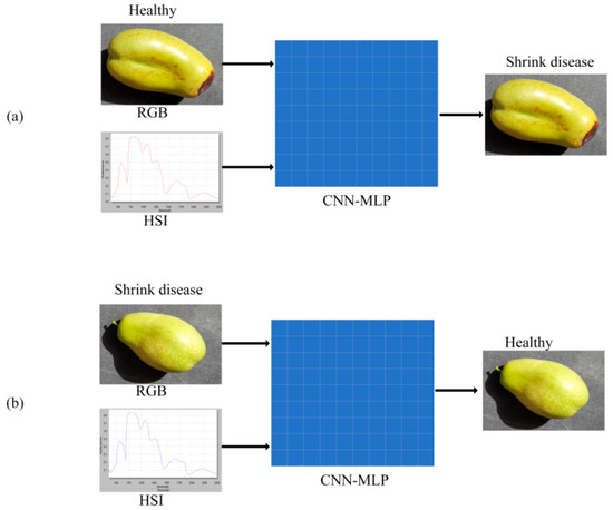 This study makes the following key contributions to the field of intelligent detection of jujube shrinkage disease: (1) a multi-source data fusion framework is proposed that combines phenotypic features extracted from RGB images with biochemical features obtained from hyperspectral imaging; (2) a dual-branch deep learning architecture is developed, integrating a convolutional neural network (CNN) for spatial feature learning and a multilayer perceptron (MLP) for spectral feature extraction; (3) a dataset consisting of 317 naturally infected ‘Junzao’ jujube fruits across different developmental stages is constructed to support early-stage detection under realistic field conditions.