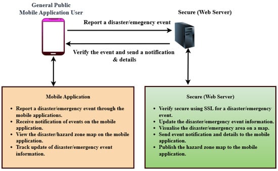 When designing a real-time disaster reporting system, the architecture is central to ensuring secure communication, ease of use, and consistent performance. This section outlines the architecture of the Disaster Emergency Events Application (DEAPP). It describes the functional and non-functional requirements and explains the main system flow shown in Figure 1. The diagram shows how users send disaster reports through the mobile app, how these are verified and processed by the web server, and how confirmed information is shared with stakeholders. All communication is secured with HTTPS, and server-side caching is used to speed up responses and improve efficiency.