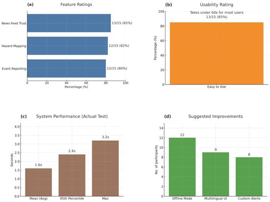 User feedback gathered through post-test interviews identified additional improvement areas, summarised in Figure 13d. Participants recommended adding Offline Mode (n = 12), Multilingual UI (n = 9), and Custom Alerts (n = 8) to enhance inclusiveness and accessibility in diverse network conditions. These suggestions provide practical direction for future iterations, emphasising the importance of adaptability and localisation in emergency communication systems.