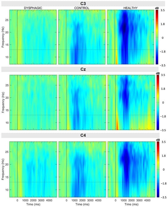 Grand average ERSP of the C3, C4, and Cz channels represented over the whole swallow (−1000 ms to 5000 ms) and the bandwidth (7 Hz to 30 Hz) within each group. A dashed horizontal line delimits alpha and beta bands.