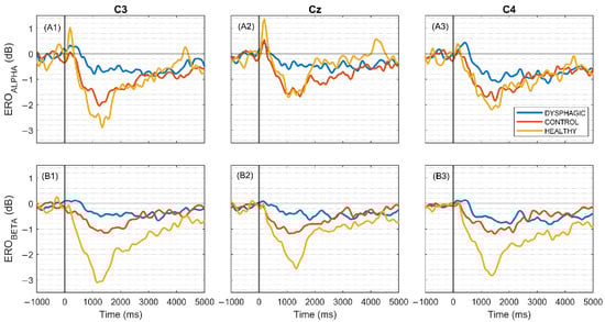 At the upper row, grand average ERO of each group for C3 (A1), Cz (A2), and C4 (A3) integrated across the alpha band (7–13 Hz). At the lower row, the same for beta band (13–30 Hz) for (B1) C3, (B2) Cz, and (B3) C4. These figures illustrate the time–frequency dynamics of event-related activity within each frequency range. The instruction of the swallow is denoted at 0 ms by a vertical line. Healthy: n = 21 subjects, mean 39.95 ± std 0.22 swallows/subject; Dysphagic: n = 47 subjects, 33.50 ± 8.65 swallows/subject; Control: n = 31 subjects, 35.41 ± 7.69 swallows/subject.
