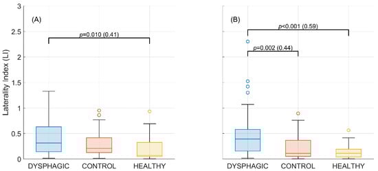 As shown in Figure 7, the dysphagia group had the highest lateralization values for both frequency bands. This difference was statistically significant when compared to the healthy group for both alpha and beta, and also to the control group for the beta band. There were no significant differences between the control and the healthy group in any of the frequency bands.
