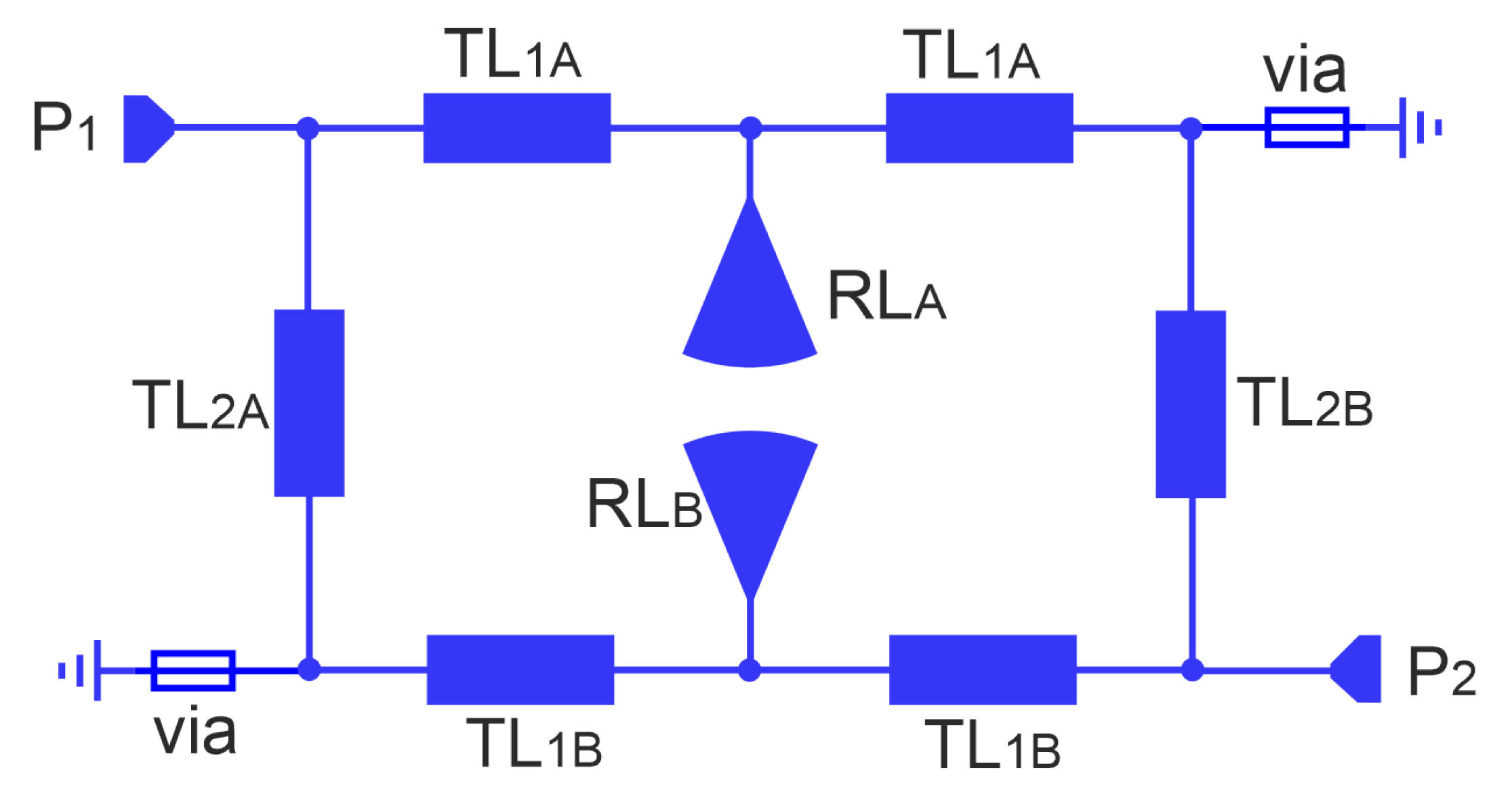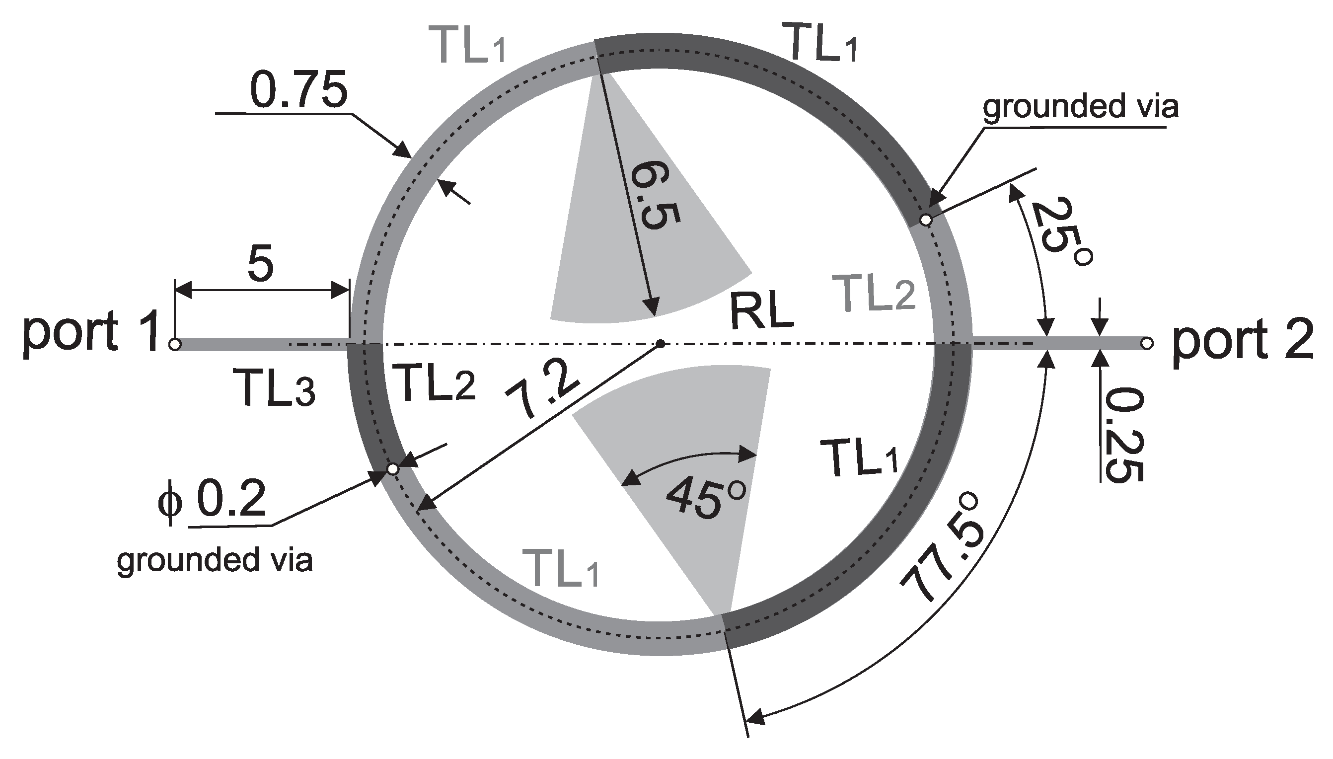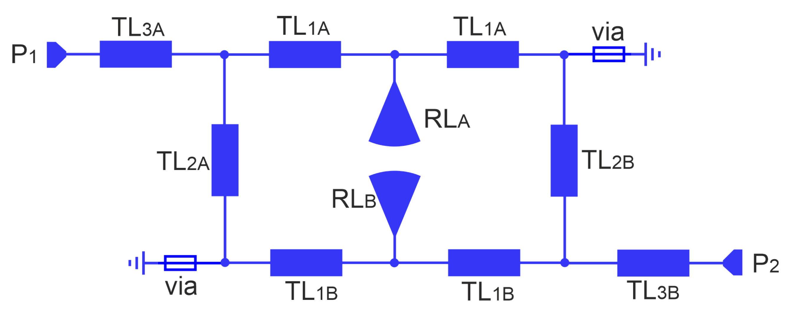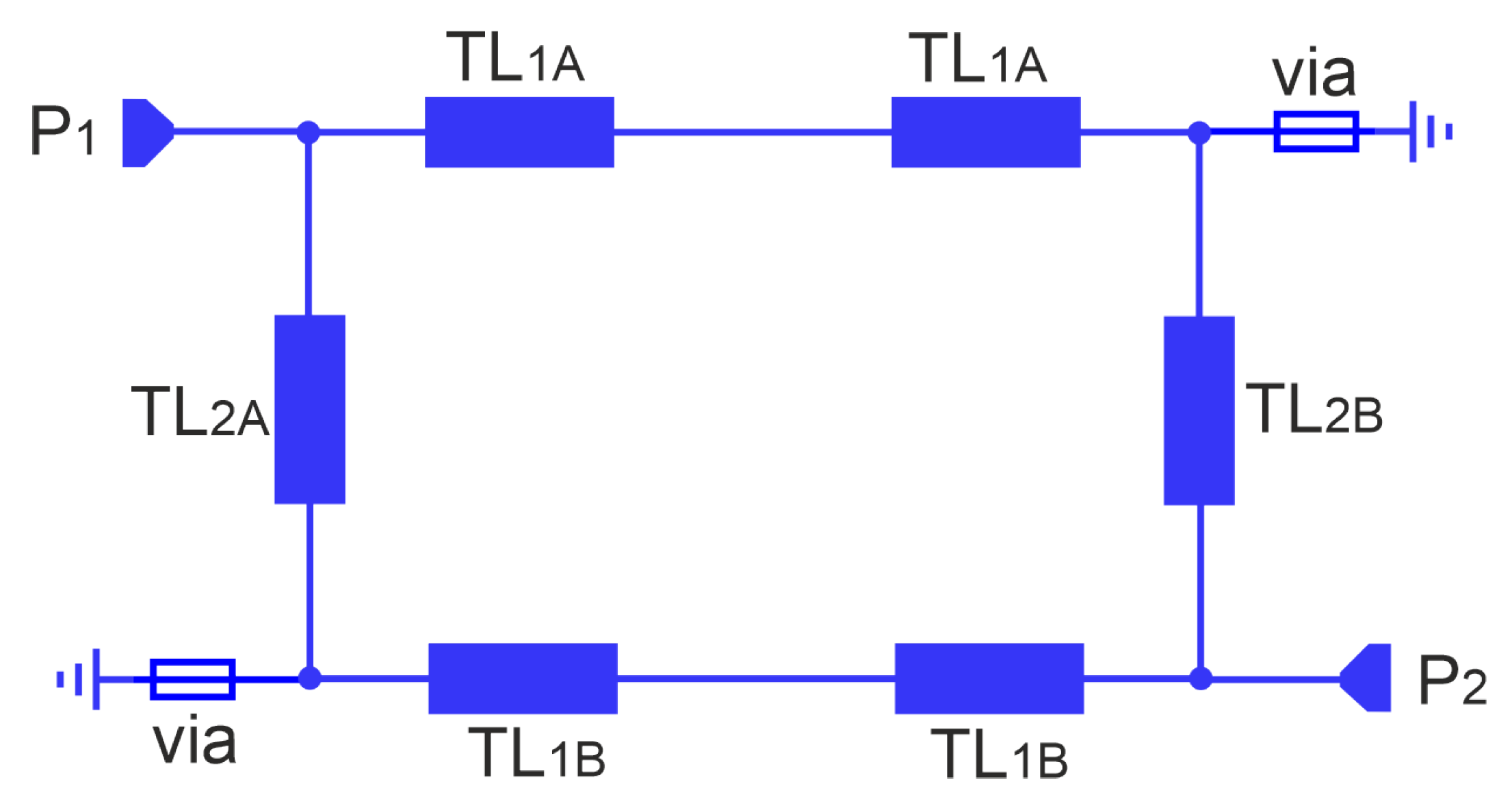 - Determine the initial length of the TL2 line to obtain the assumed center frequency, neglecting the contribution of the vias: