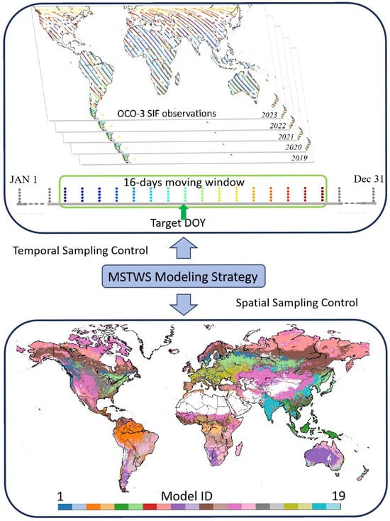 While the spatiotemporal-specific strategy is recognized for its superior performance and is adopted in this work, its direct application is challenged by the daily resolution of the DOSIF target. At this fine temporal scale, the samples from OCO-3 are inherently limited in number and diversity and are insufficient for constructing multiple robust models across different spatiotemporal divisions. Therefore, we propose a Moving Spatial–Temporal Window Sampling (MSTWS) strategy, which focuses on predicting DOY-specific SIF values. Instead of attempting to model every single day from 2001 to the present, we model each DOY (day of the year). Each DOY model can then be used to predict the SIF for the same DOY in any year.