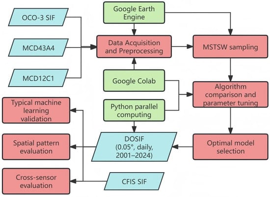 The task of processing daily data from 2001 to the present, particularly the seven bands of 500 m resolution MCD43A4 data, poses significant challenges for traditional data-processing methods. Fortunately, the Google Earth Engine (GEE) provides cloud-based data storage, object-based computation, and a highly concurrent computing environment [37,38,39]. All feature generation steps were completed using GEE, including feature matching for training data and the generation of global daily features spanning over 20 years. Data preprocessing, cleaning, and organization, as well as model training, were conducted in the Python 3.9 environment. Model training utilized parallel computing in Python and Google Colab [40]. The seamless integration of Python’s modeling capabilities with GEE’s cloud-based data handling and large-scale data processing ensured smooth operation of the entire framework. Figure 2 shows the workflow of the DOSIF reconstruction.