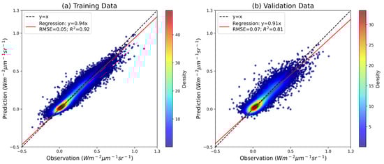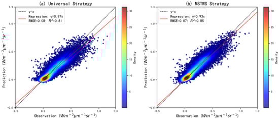 To evaluate the effectiveness of the MSTWS strategy, we compared the predictive performance of two modeling approaches using the same reserved validation dataset: a universal model, trained on all aggregated samples regardless of date or location, and a DOY-specific model trained under the MSTWS strategy. The comparison results are shown in Figure 5. For the universal strategy, the overall prediction statistics are R2 = 0.81, RMSE = 0.08 Wm−2 μm−1 sr−1, and slope = 0.87, while for the MSTWS strategy, the results are R2 = 0.85, RMSE = 0.07 Wm−2 μm−1 sr−1, and slope = 0.93.
