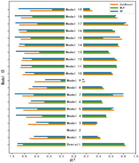 Figure 4 presents the performance comparison of the three machine learning algorithms—Artificial Neural Networks (ANNs), Random Forest (RF), and CatBoost—across all sub-models defined in Table 1. The analysis reveals the following key findings.