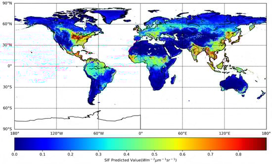 As an illustrative example, Figure 6 shows the spatial pattern of DOSIF on 1 August 2023. This date corresponds to the peak of the growing season for most vegetation in the northern hemisphere. The high SIF values captured by DOSIF reflect the expected seasonal contrast between hemispheres and highlight regions of high vegetation productivity, including temperate and tropical croplands. Prominent examples include the U.S. Midwest Corn Belt and major agricultural zones in Asia, where photosynthetic activity often exceeds that of tropical forests during peak growth periods. Moderate SIF values are observed over deciduous broadleaf forests (DBFs) and high-latitude needleleaf forests (NFs), while low SIF values appear in arid and sparsely vegetated areas of the southern hemisphere during its austral winter. These spatial distributions are consistent with the patterns of gross primary productivity (GPP) reported in previous studies [20,26,41]. The spatial visualization of DOSIF on this date supports the prediction statistics discussed earlier and demonstrates the dataset’s ability to resolve fine-scale spatiotemporal variability at daily and 0.05-degree resolution.