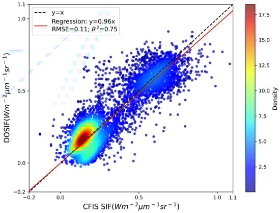 To further validate the accuracy and reliability of the reconstructed DOSIF dataset, we performed a cross-sensor comparison using independent airborne SIF measurements from the Carbon Flux Imaging Spectrometer (CFIS) mission. This airborne dataset offers high-fidelity, direct observations of solar-induced chlorophyll fluorescence, making it an ideal benchmark for evaluating the effectiveness of our data-driven reconstruction framework under the MSTWS strategy. The validation results are presented in Figure 7. The model achieved the following prediction statistics against CFIS observations: R2 = 0.75, RMSE = 0.11 W·m−2·μm−1·sr−1, and slope = 0.96. Given the challenging nature of cross-sensor validation—especially with high-precision airborne measurements—the obtained results are considered robust and satisfactory. These findings provide compelling evidence for the effectiveness of our MSTWS-based modeling approach in reconstructing long-term, daily resolution SIF with both spatial and temporal fidelity. The consistency with CFIS further reinforces the scientific credibility and practical utility of the DOSIF dataset.