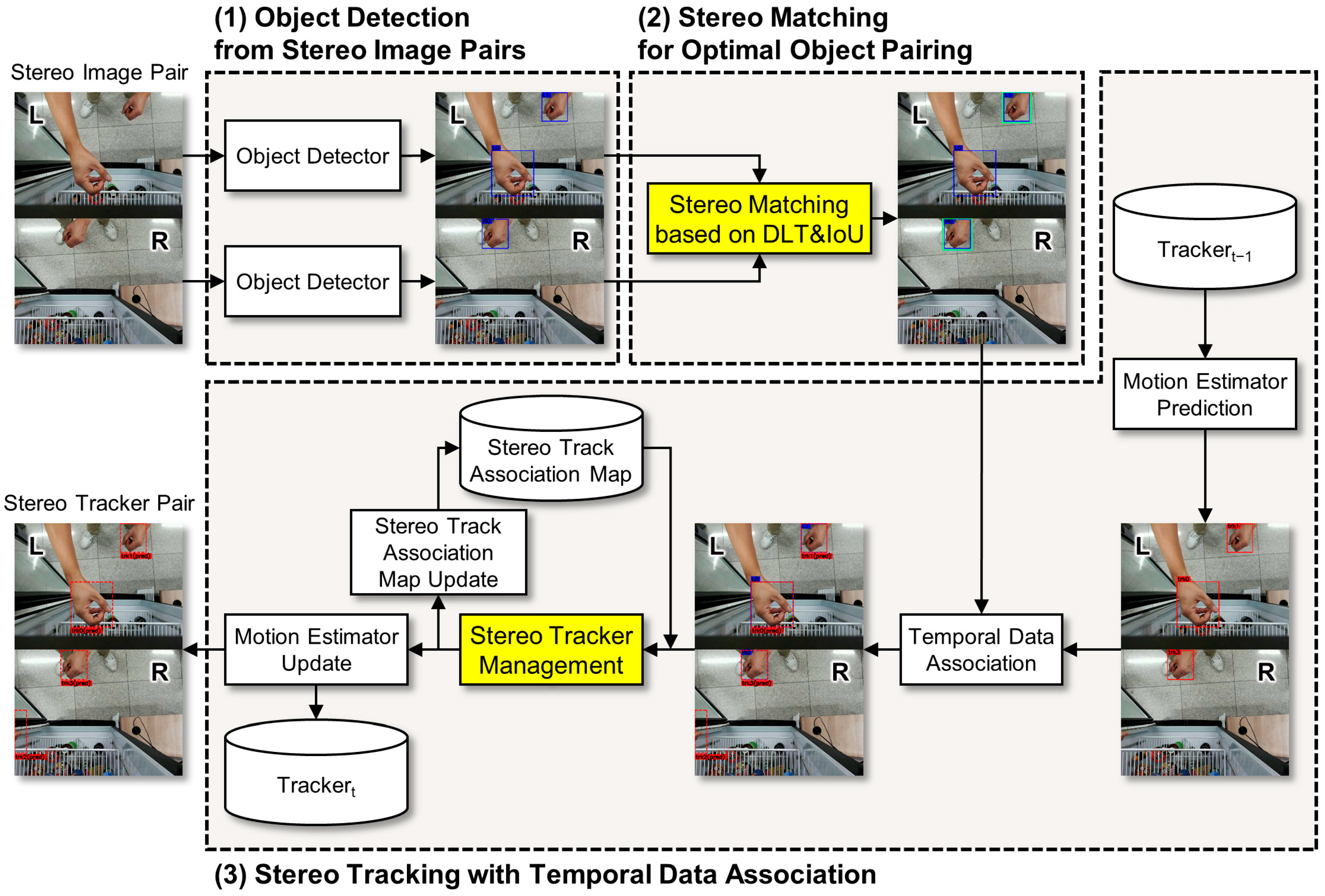 Overall architecture of the proposed 2.5D multi-object tracking framework. The system consists of three sequential stages: (1) Object Detection from Stereo Image Pairs, where independent detection is performed on synchronized left (L) and right (R) images; (2) Stereo Matching for Optimal Object Pairing, which establishes correspondences between detected objects using Direct Linear Transform (DLT)-based triangulation and IoU validation (highlighted in yellow); and (3) Stereo Tracking with Temporal Data Association, which maintains object IDs across frames through tracker management (highlighted in yellow), motion estimation, and stereo track association map updates. The feedback loop from tracking predictions enhances detection and matching in subsequent frames.