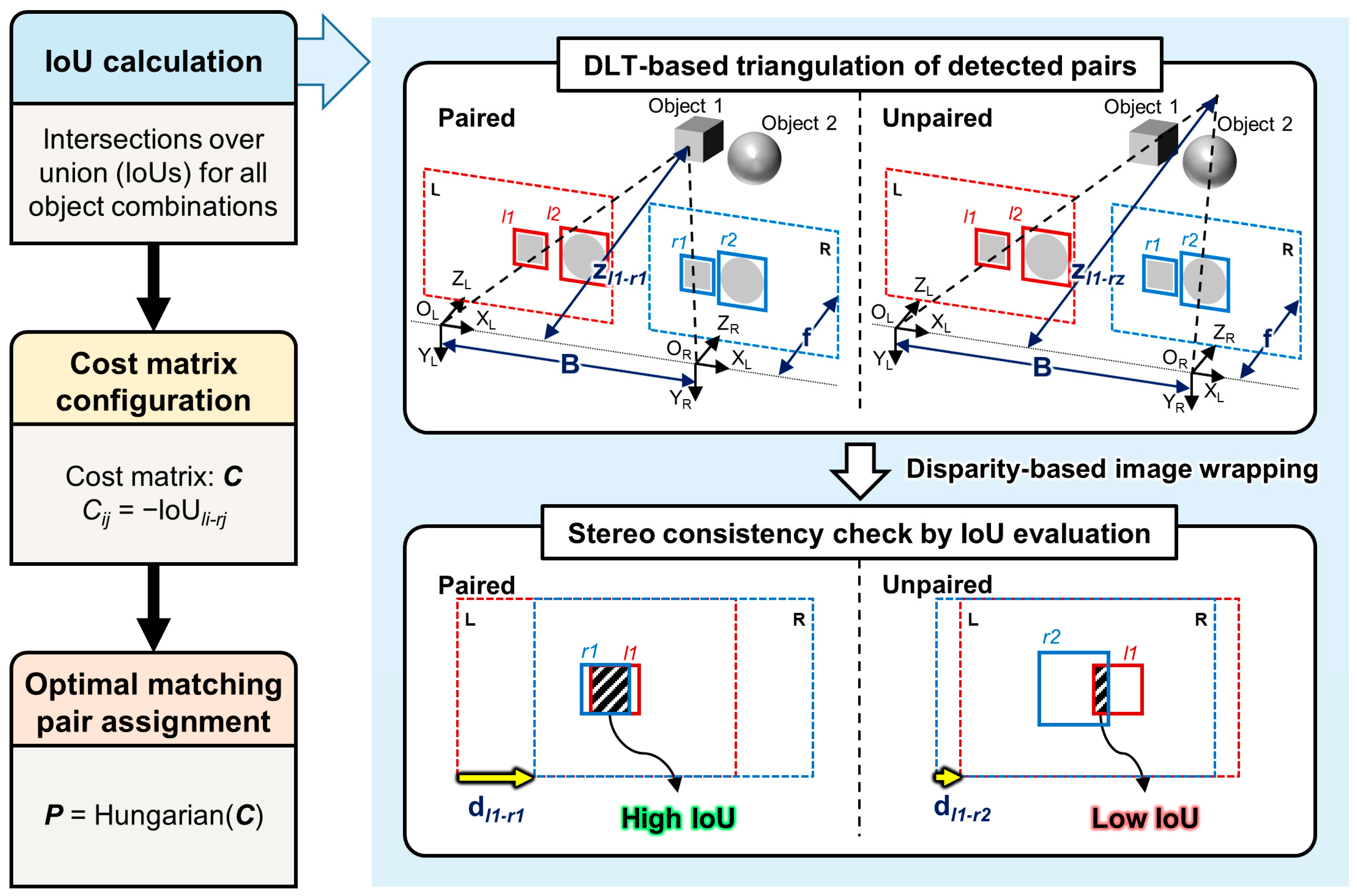 Using the computed disparity, each bounding box is warped to the opposite view through disparity-based image warping [42]. The stereo consistency is then evaluated by computing the IoU between the warped bounding box and the actual detection in the target image. This IoU metric quantifies the geometric consistency of the hypothesized correspondence [43]. Figure 2 demonstrates how high IoU values indicate correct matches (paired objects), while low IoU values suggest incorrect correspondences (unpaired objects).