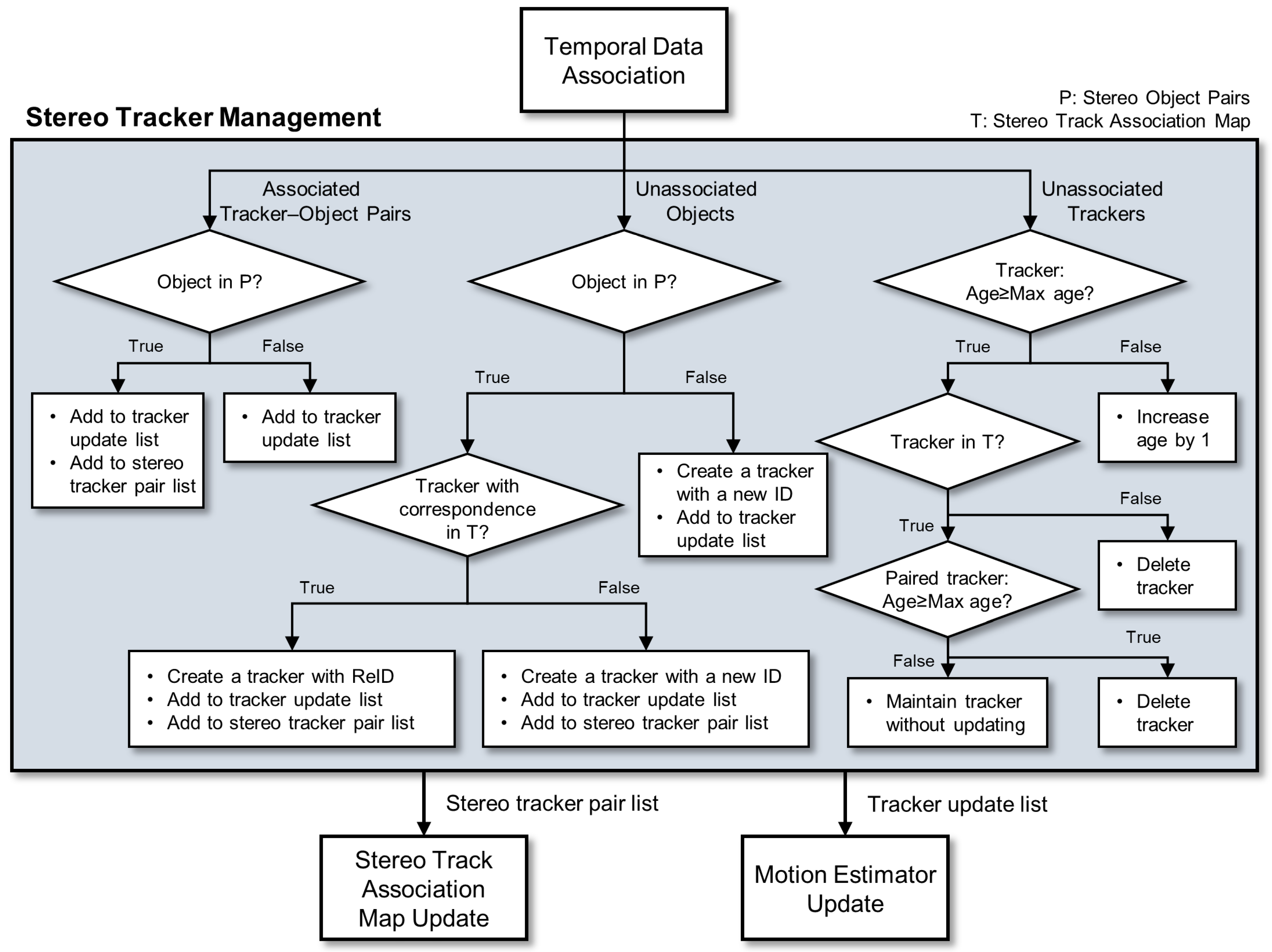 The modular design in tracker management allows integration with existing tracking algorithms for temporal data association and motion estimation components, providing flexibility in implementation while maintaining the benefits of stereo-aware tracking [50]. The complete stereo tracking process is described in Algorithm 3 using pseudocode notation.