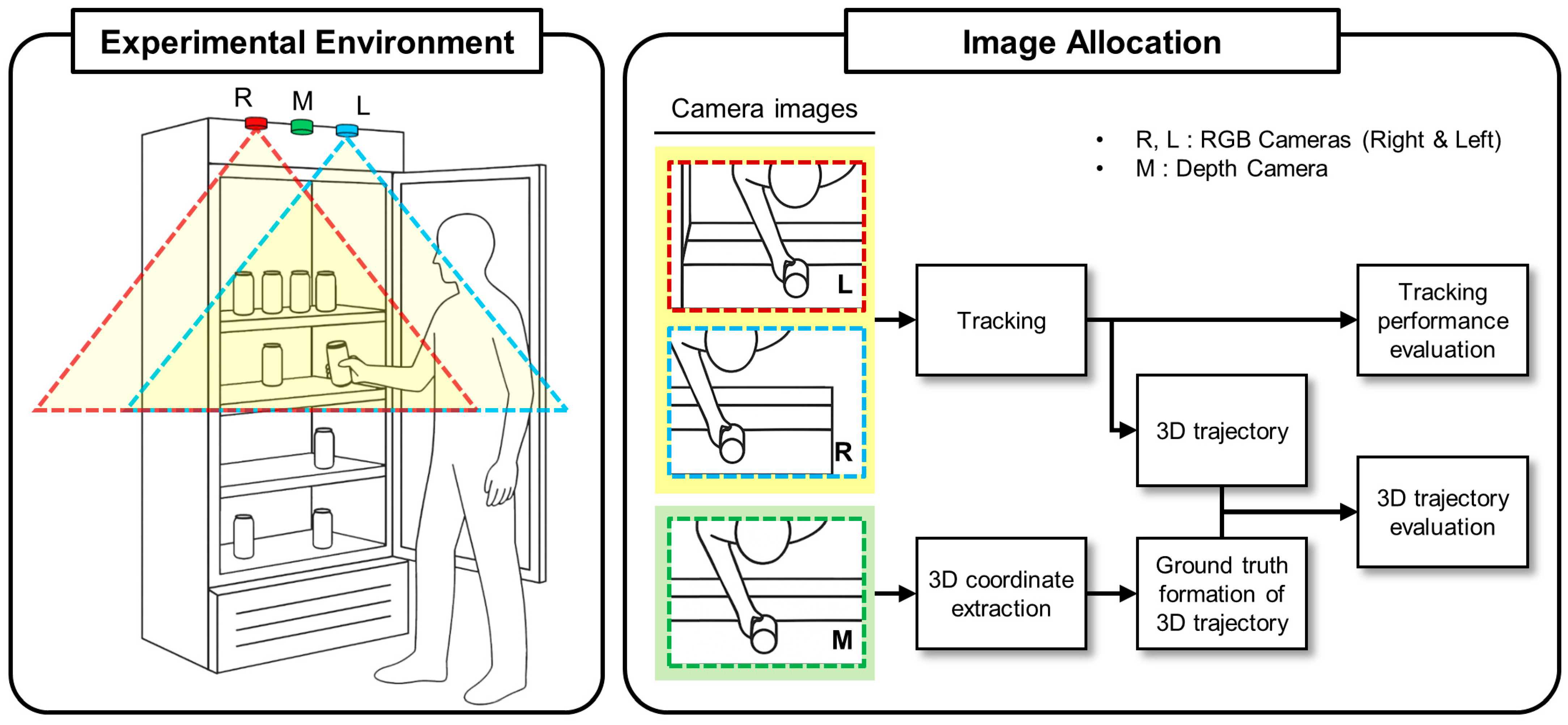 Experimental setup and data processing pipeline for 2.5D multi-object tracking validation. The left panel shows the physical configuration with stereo RGB cameras (L: left, R: right) and a depth camera (M: middle) mounted at the top of a commercial refrigerator. The yellow triangular regions outlined by red and cyan dashed lines indicate the fields of view for the left and right cameras, respectively. The right panel illustrates the image allocation and processing workflow: stereo RGB camera images are processed through the tracking system to generate 3D trajectories, which are then compared with ground truth from the depth camera for both tracking performance evaluation and 3D trajectory validation.