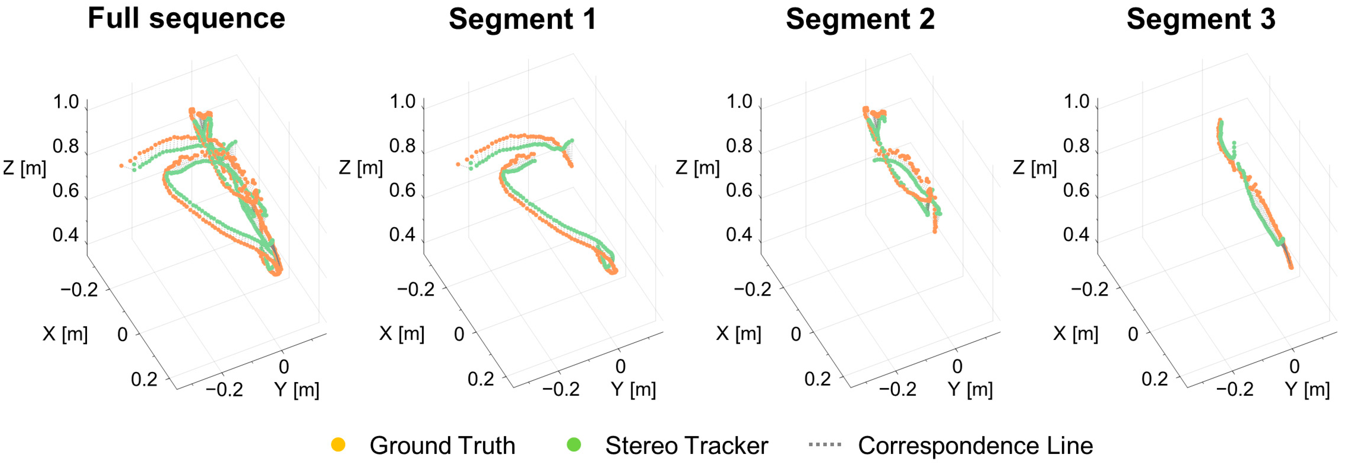 Second, quantitative evaluation of 3D trajectory accuracy requires depth ground truth that is spatially and temporally aligned with stereo image pairs. However, existing public datasets either provide only 2D annotations or rely on LiDAR depth that is not synchronized with stereo inputs. To address this limitation, our dataset includes ground-truth depth obtained by synchronizing a stereo camera system with a calibrated depth sensor, enabling accurate 3D validation.