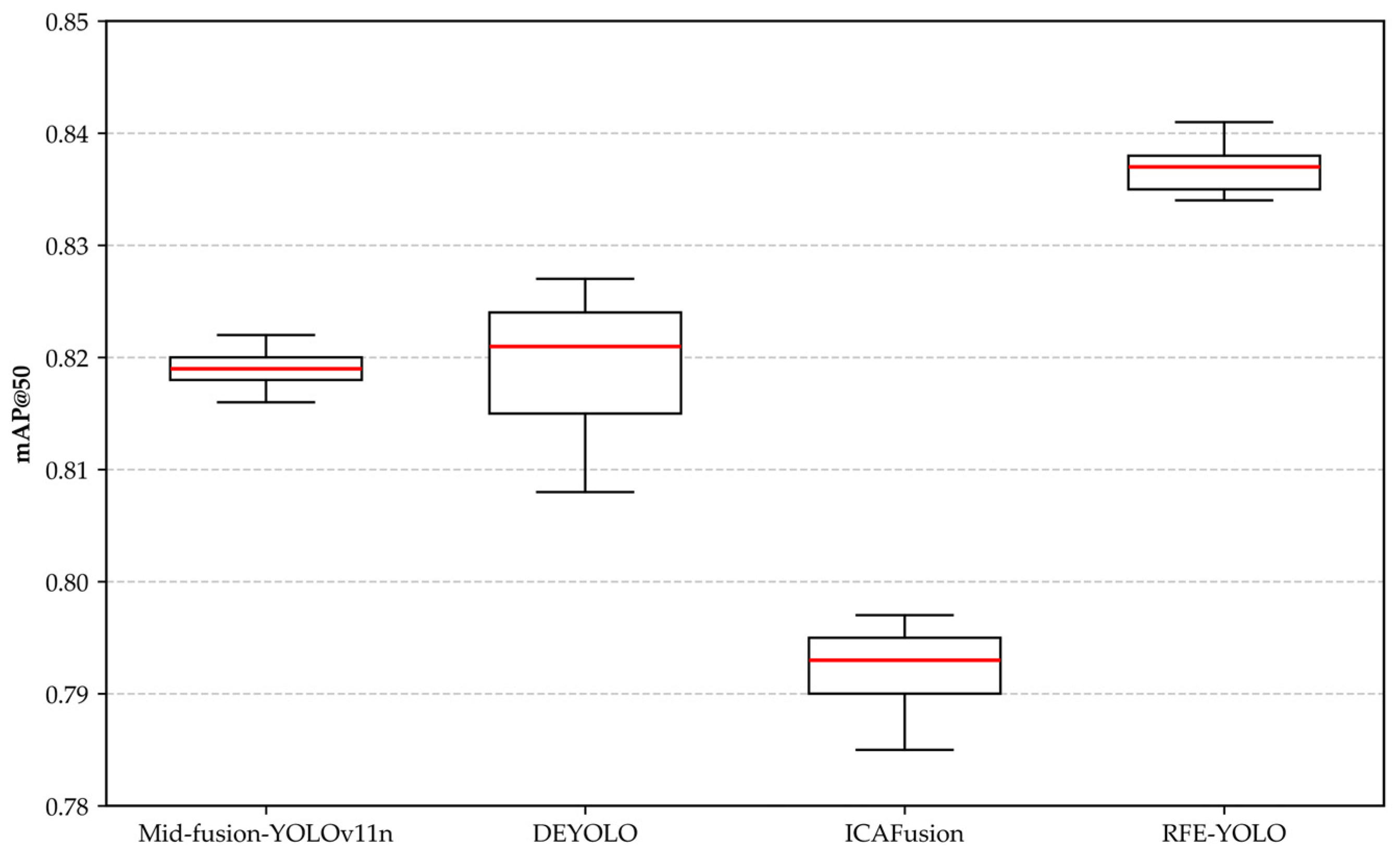 In the RGB and IR dual-modality comparison experiments, four models were selected for comparison: mid-stage fusion YOLOv11n, DEYOLO, ICAFusion, and RFE-YOLO. Each set of experiments was independently repeated five times, and the results were plotted as box plots to demonstrate the performance distribution and stability of different models across multiple experiments, as shown in