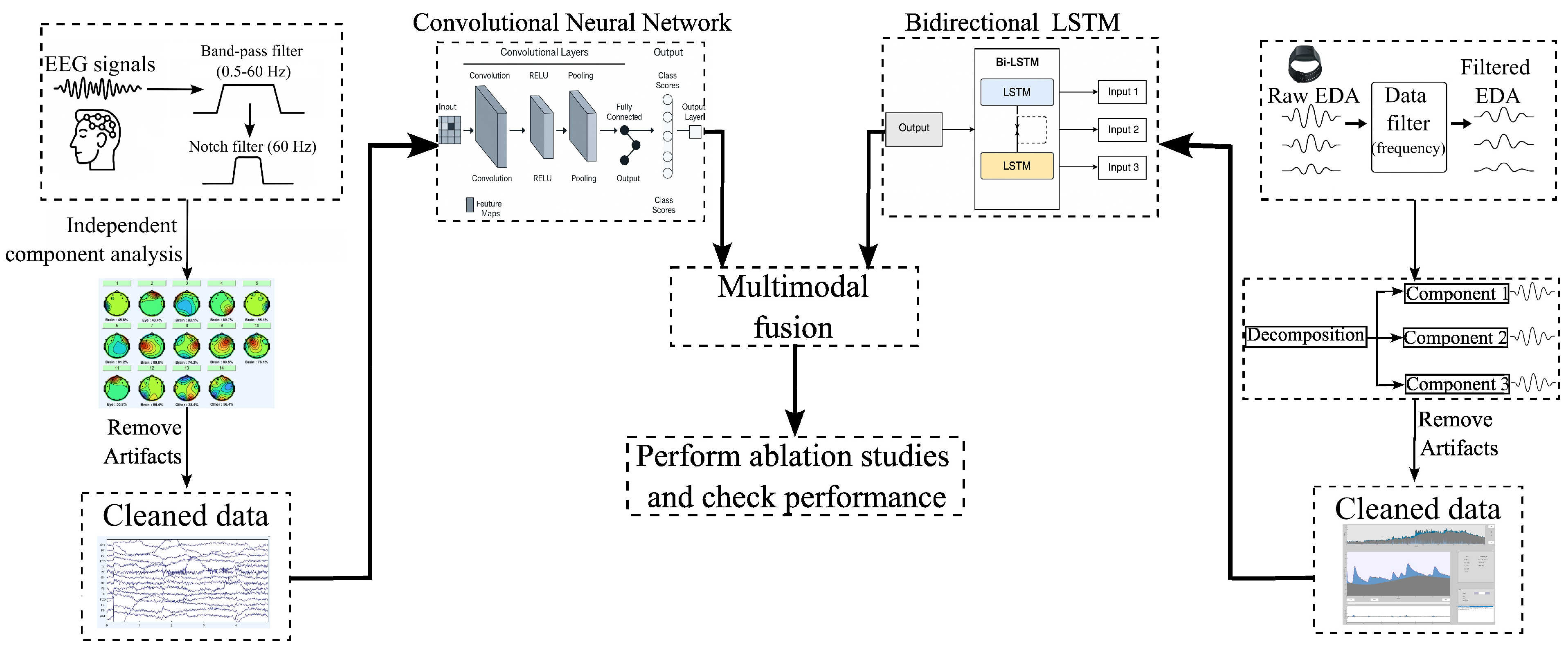 The baseline system combined a CNN for EEG with a Bi-LSTM for EDA, integrated through stacked late fusion and a validation-gated fallback to EEG (