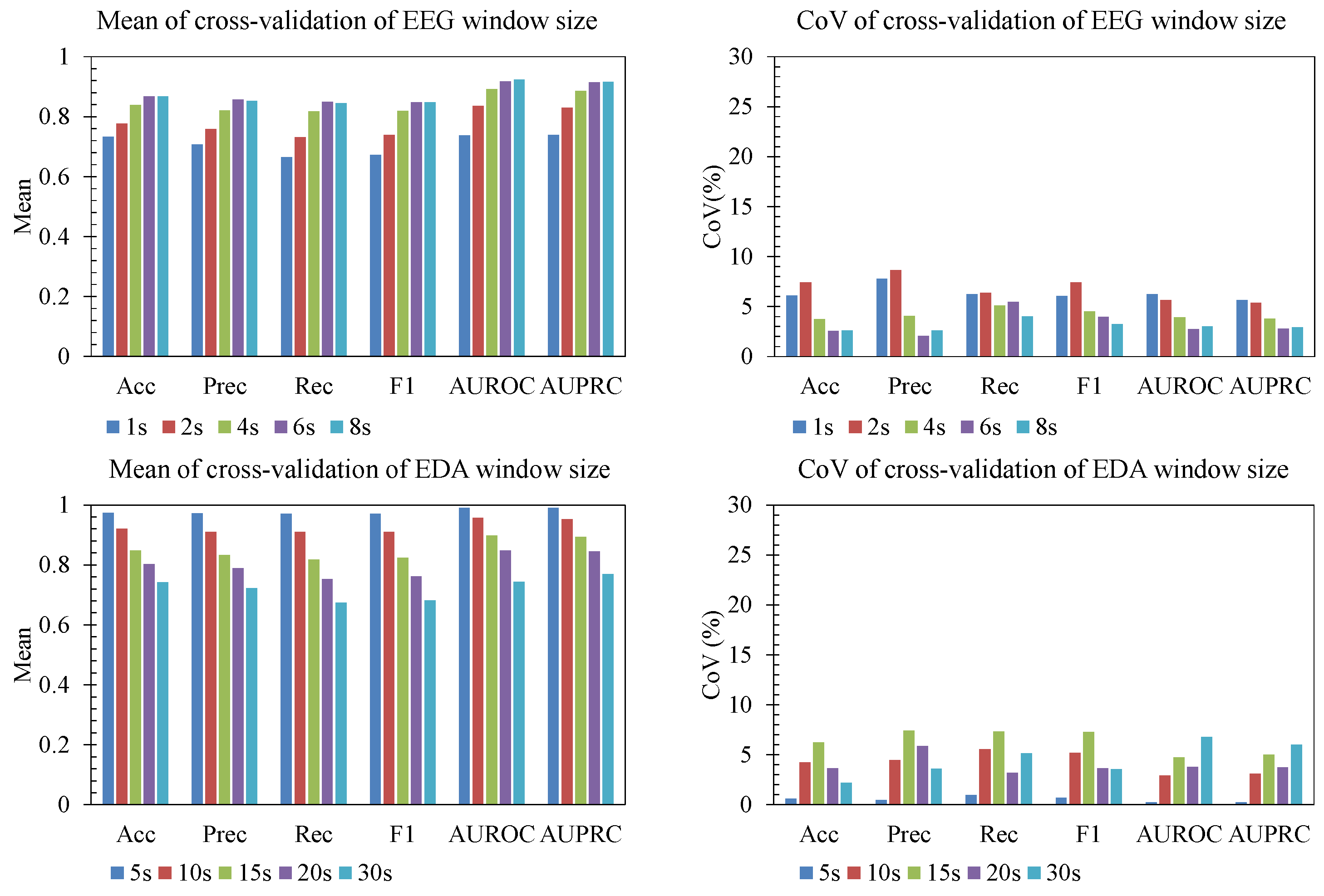 Figure 5 demonstrates the effect of window size on both EEG and EDA signals. We report both the mean and the coefficient of variation (CoV) of all performance metrics across folds to characterize accuracy and stability. Window size had a clear impact on performance, and the effect differed by modality. For EEG, medium window size (6 s) yielded the highest performance, with accuracy and F1 peaking in this range. Performance declined for longer windows (8 s), likely because temporal averaging over longer segments attenuates fast neural responses to noise. For EDA, the pattern was different: shorter segments (5 s) produced the strongest results in this dataset (e.g., accuracy 0.97, F1 0.97, AUROC 0.99), whereas performance dropped as the window increased, with 20–30 s windows showing substantially lower accuracy and F1. This indicates that temporal resolution should be matched to the intrinsic dynamics of each modality: EEG benefits from short windows that preserve rapid fluctuations, while EDA typically benefits from slower integration but still degrades if windows become too long and the number of training samples drops.